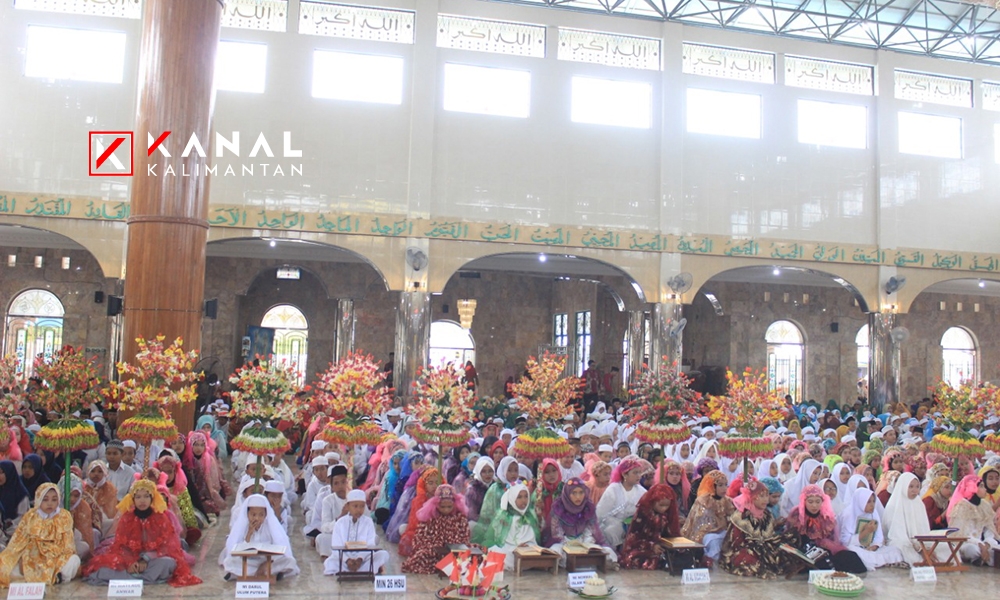AMUNTAI, Sebanyak 1.515 pelajar Madrasah Ibtidaiyah (MI) se Kabupaten Hulu Sungai Utara (HSU) dengan fasih melantunkan ayat-ayat suci Al Qur’an dalam khataman Al Qur’an Massal di Mesjid Raya At Taqwa Amuntai, Kamis (20/6).
