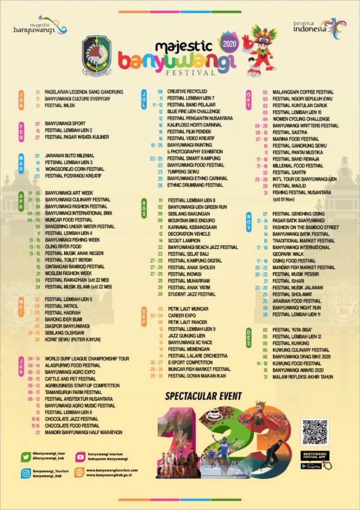 BANYUWANGI, Menteri Pariwisata Wishnutama Kusubandio dan Bupati Banyuwangi Abdullah Azwar Anas meluncurkan 123 atraksi dalam Banyuwangi Festival 2020, Rabu (8/1/2020), di Jakarta. Dengan demikian mempertegas posisi Banyuwangi sebagai kota festival. 123 atraksi yang diluncurkan sangat beragam. Ada seni-budaya, sport tourism, hingga kuliner.