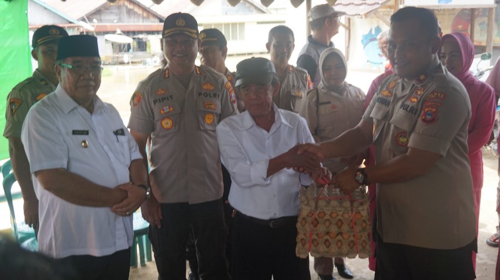 Kapolres HSU AKBP Pipit Subiyanto menyerahkan bantuan kepada korban kebakaran desa Tangga Ulin Hulu. foto: dew