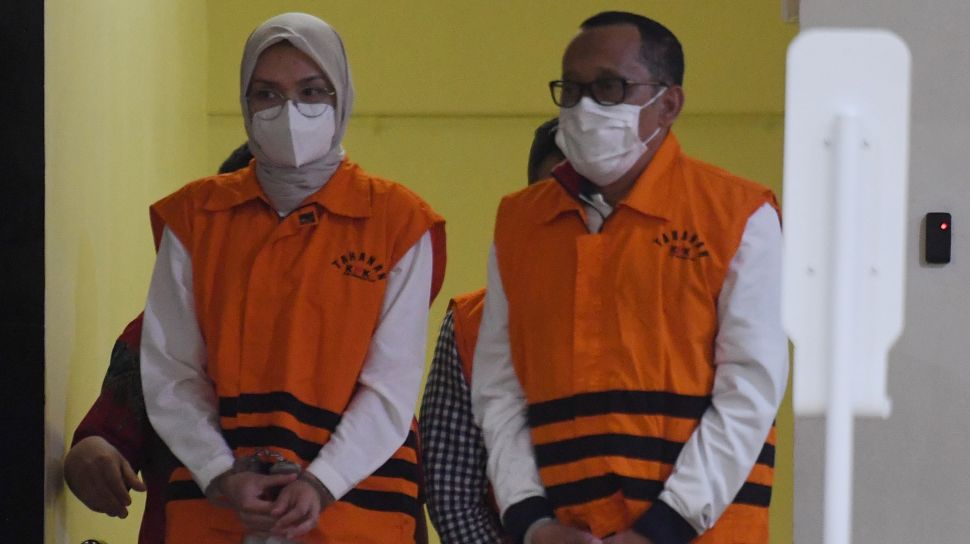 Bupati Probolinggo Puput Tantriana Sari (kanan) bersama suaminya yang juga anggota DPR dan mantan Bupati Probolinggo Hasan Aminuddin mengenakan rompi tahanan KPK usai diperiksa di gedung KPK, Jakarta, Selasa (31/8/2021) dini hari. Foto: ANTARA FOTO/Hafidz Mubarak
