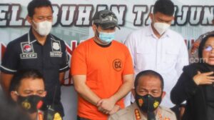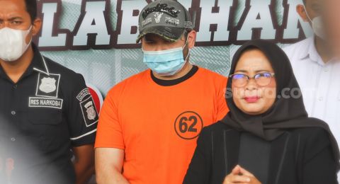 Penyanyi Ridho Rhoma ketika dihadirkan saat rilis kasus narkoba yang menjeratnya di Polres Pelabuhan Tanjung Priok, Jakarta Utara, Senin (8/2/2021). [Suara.com/Alfian Winanto]