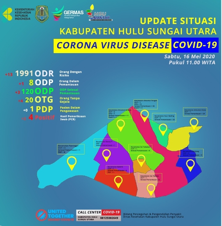 Dari paparan Tim Gugus Tugas Pencegahan, Pengendalian, Penanganan, (P3) Covid-19 HSU, Sabtu (16/5/2020) pukul 11.00 Wita, menyatakan dari total 4 Kasus positif, 2 kasus barunya beranda di Kecamatan Amuntai Tengah. Sehingga kasus Orang Tanpa Gejala (OTG) pun kini mengalami penambahan dari sebelumnya 16 kasus menjadi 20 kasus.