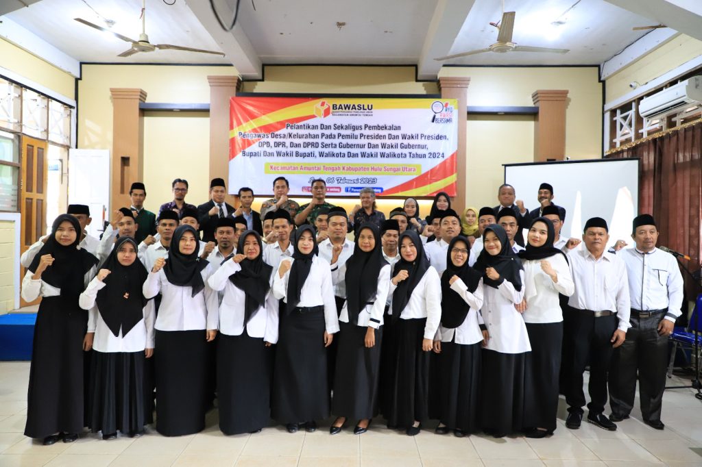 KANALKALIMANTAN.COM, AMUNTAI – Sebanyak 29 Pengawas Kelurahan Desa (PKD) Kecamatan Amuntai Tengah resmi dilantik dan diambil sumpah untuk menjalankan pengawasan tahapan Pemilu 2024, Senin (6/2/2023).