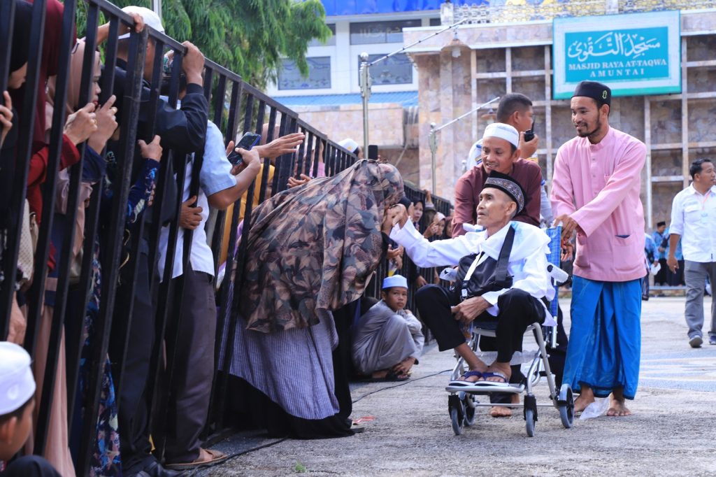 Jemaah calon haji Kabupaten HSU berangkat menuju Embarkasi Banjarmasin dilepas dari Masjid Raya At-Taqwa Amuntai diiringi ratusan keluarga, Rabu (7/6/2023). Foto: dew