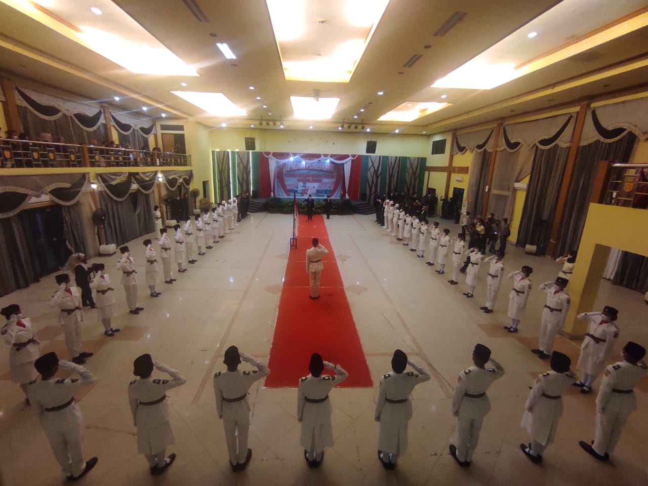 Seluruh anggota Paskibraka yang dikukuhkan tampak larut dalam upacara di gedung Bina Satria Banjarbaru, Senin (15/8/2022) malam.