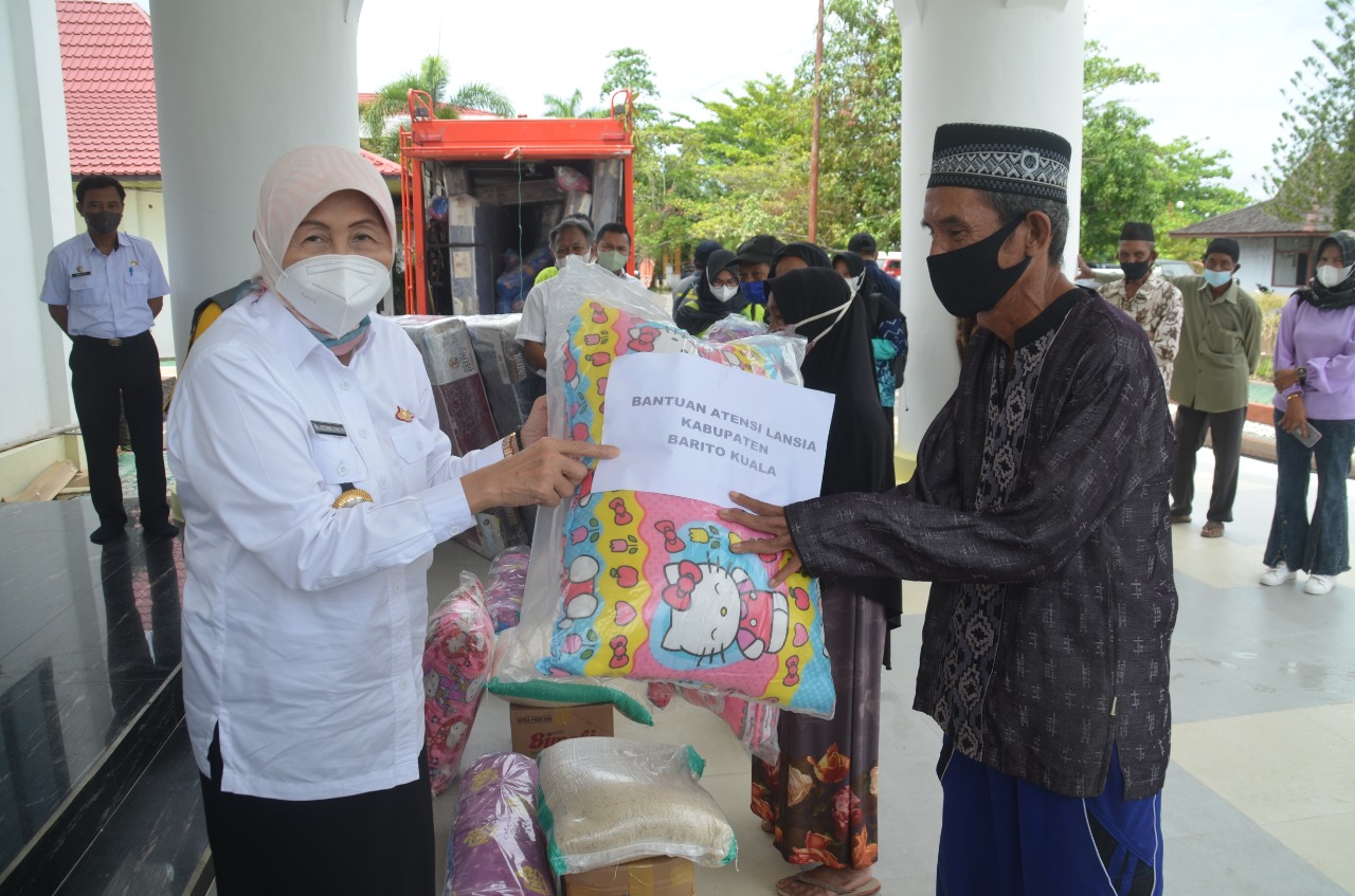 Bantuan sendiri diserahkan Bupati Batola Hj Noormiliyani AS secara simbolis kepada 5 perwakilan lansia di kediamannya, Rabu (08/12/2021).