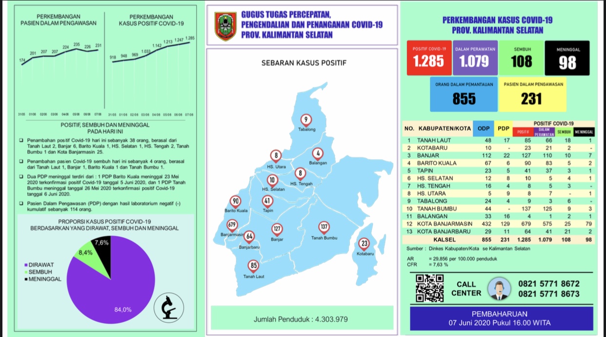 KANALKALINANTAN.COM, BANJARBARU – Setelah sempat mengalami lonjakan, temuan kasus positif Covid-19 di Kalimantan Selatan pada Minggu (7/6/2020) sedikit melandai. Data dari Tim Gugus Tugas Percepatan Penanganan (P2) Covid-19, jumlah kasus positif Covid-19 di Kalsel mencapai 1.285 kasus.
