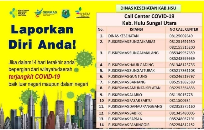Ia menghimbau masyarakat untuk dapat melaporkan jika dalam waktu 14 hari terakhir baru datang bepergian dari daerah/wilayah yang terjangkat Covid-19 melalui call center Covid-19 Kabupaten HSU : 08125002649 atau call center masing-masing Poskesmas di Kabupaten HSU. (kanalkalimantan.com/dew)