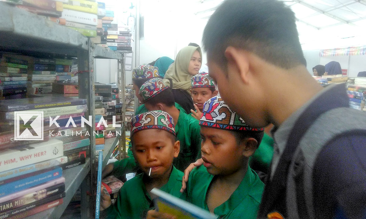 BANJARBARU, Sekitar 40 orang anak panti asuhan datang menyerbu salah satu stand yang ada di Kalsel Book Fair (KBF) 2018, Rabu (4/4). Tak sekedar datang dan melihat-lihat saja, anak-anak panti asuhan menerima buku gratis dari KBF 2018.