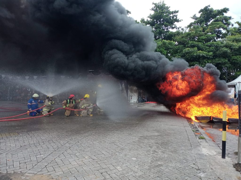 Respon cepat pemadaman api disimulasikan petugas Damkar. Dengan memakai formasi pola 4B dan teknik pemadaman yang benar, api besar yang sengaja dinyalakan di tengah lapangan Taman Kamboja seketika padam.