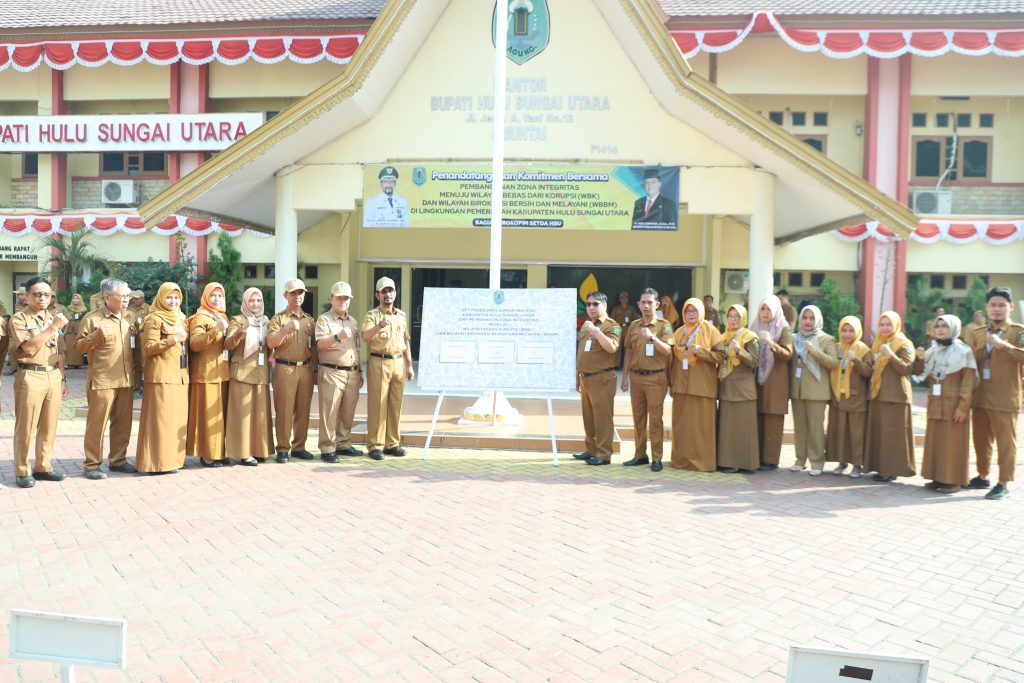 KANALKALIMANTAN.COM, AMUNTAI – Penjabat (Pj) Bupati Hulu Sungai Utara (HSU) Zakly Asswan diikuti seluruh pejabat Satuan Kerja Perangkat Daerah (SKPD) melakukan penandatanganan komitmen bersama dalam pembangunan zona integritas menuju Wilayah Bebas Korupsi (WBK) dan Wilayah Birokrasi Bersih dan Melayani (WBBM) di halaman kantor Bupati HSU, Senin (29/7/2024) pagi.