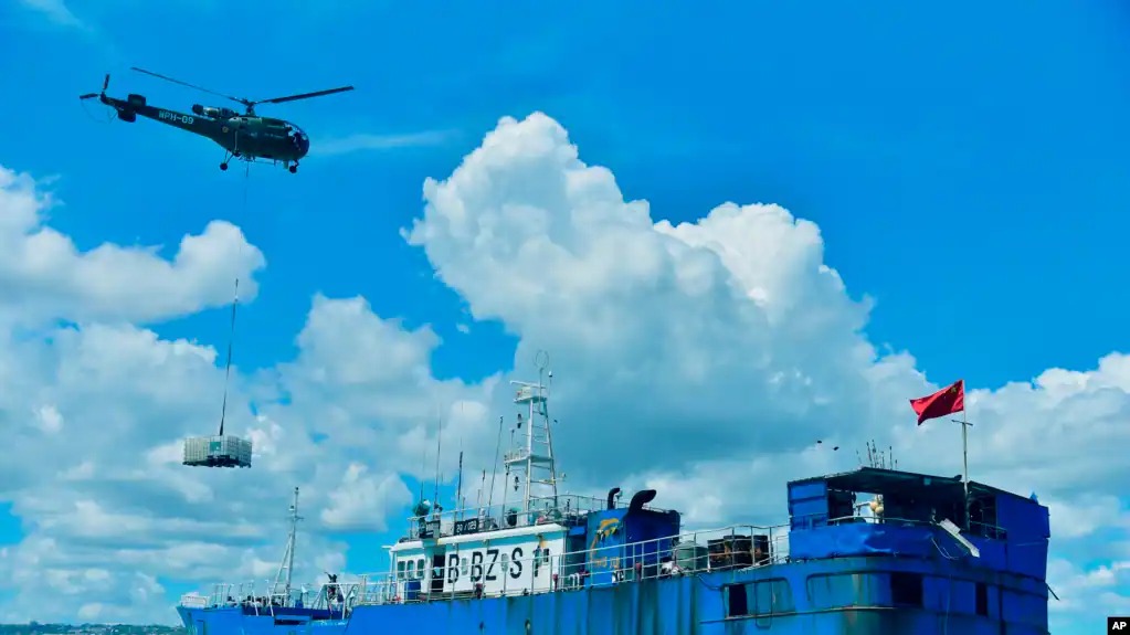 Helikopter menjatuhkan kontainer berisi peralatan pompa minyak ke dek FV Lu Rong Yuan Yu, kapal penangkap ikan berbendera China yang kandas, di Pointe-aux Sables, Port-Louis, Mauritius, Selasa 9 Maret 2021. (Beekash Roopun/L’express Maurice via AP/ilustrasi)