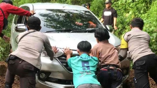 Mobil yang dievakuasi petugass saat tersesat di Hutan Gunung Putri Desa Maniis, Kabupaten Majalengka. (Antara)