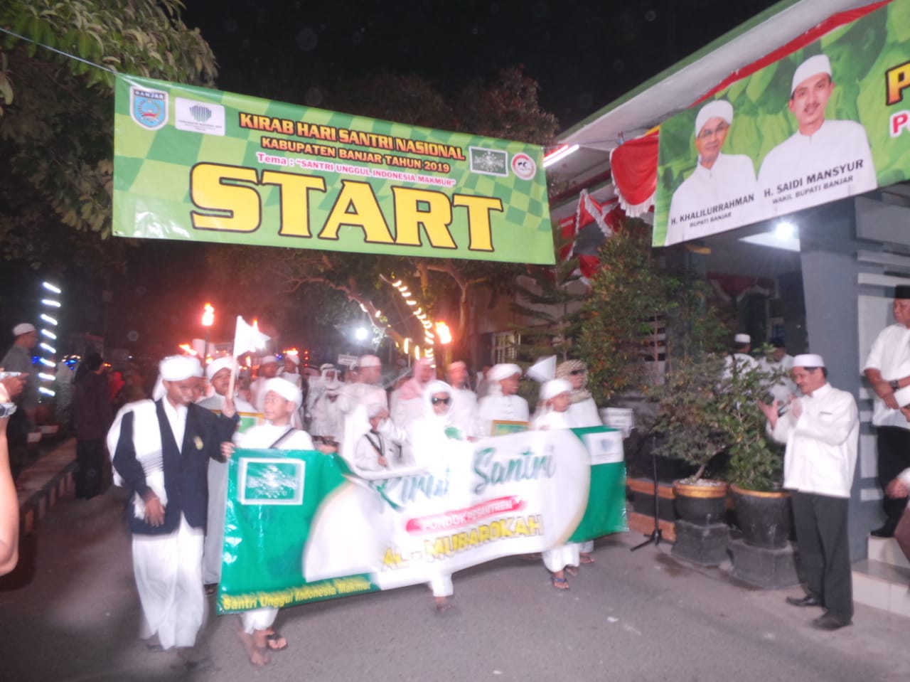MARTAPURA, Diikuti 19 grup pondok pesantren asal Kabupaten Banjar, Kirab Santri rangkaian Hari Santri Nasional 2019 berlangsung meriah. Puluhan obor yang dibawa santri nampak menerangi halaman Pemerintah Kabupaten Banjar pada Rabu (23/10) malam.
