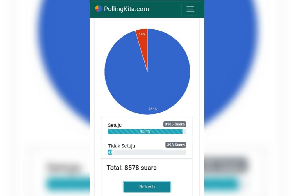 Total suara sampai Minggu (11/7/2021) yang mengikuti polling sejumlah 8.578, sebanyak 8.185 dengan persentase 95,4% suara memilih setuju dan 393 suara dengan persentase 4,6% memilih untuk tidak setuju.