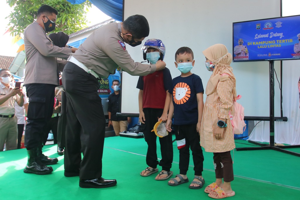 Peresmian Kampung Tertib Lalu Lintas ditandai dengan pemasangan helm mini dan pemakaian masker oleh Tim Korlantas Polri, Wakil Bupati Banjar dan Kapolres Banjar kepada anak-anak Komplek Al Jihad. Selain itu juga diserahkan buku lalu-lintas untuk warga. (kanalkalimantan.com/mckominfobanjar/yuda)