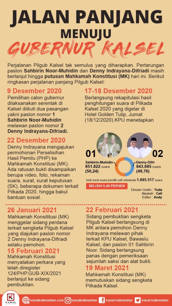Dan akhirnya, Jumat (30/7/2021), MK membacakan putusan putusan gugatan paslon Denny Indrayana-Difriadi (H2D) terkait sengketa Pemungutan Suara Ulang (PSU) Pilgub Kalsel yang intinya menolak meneruskan permohonan H2D dan meminta KPU Kalsel menetapkan paslon Sahbirin-Muhidin sebagai pemenang Pilgub 2020!