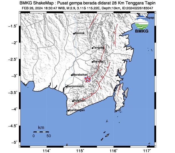 “#Gempa (UPDATE) Mag:2.9, 26-Feb-24 18:30:47 WIB, Lok:3.11 LS, 115.22 BT (Pusat gempa berada didarat 28 Km Tenggara Tapin), Kedlmn:10 Km Dirasakan (MMI) II – III Tapin #BMKG,” tulis akun X terverifikasi BMKG, Minggu (18/2/2024) siang.