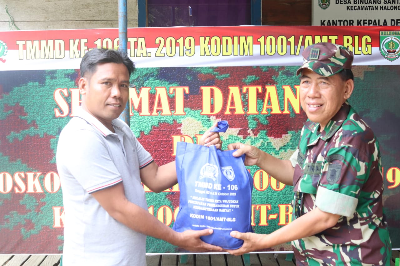 PARINGIN, Tak hanya melakukan perbaikan infrastruktur dan bedah rumah, Komandan Kodim 1001/Amuntai-Balangan melalui perwira seksi toritorial selaku satgas TMMD ke-106 juga melaksanakan kegiatan sosial lainnya. Seperti memberikan bantuan sembako bagi warga yang kurang mampu di jalan Pendidikan No 02 Desa Binuang Santang, Kecamatan Halong, Kabupaten Balangan.