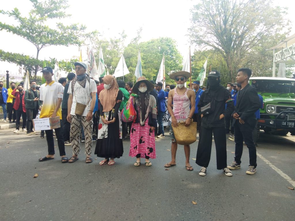 Menariknya beberapa mahasiswa mengenakan kostum petani, pedagang, hingga nelayan terlihat dibariskan untuk memimpin jalannya aksi.