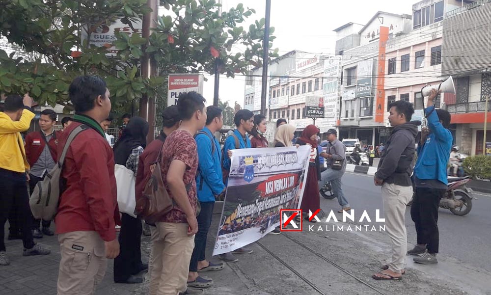 BANJARMASIN, Puluhan aktivis mahasiswa berkumpul di depan Mitra Plaza Banjarmasin, Rabu (22/5/2019). Mereka menyuarakan ihwal agar tidak melupakan salah satu sejarah kelam di kota Banjarmasin, yaitu Tragedi Jumat Kelabu.