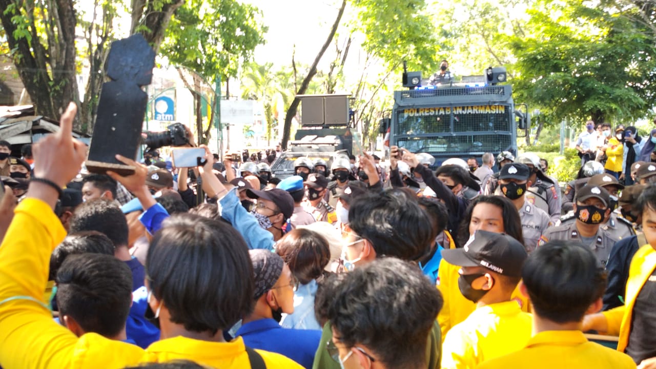 Demo sempat diwarnai aksi saling dorong mahasiswa dengan aparat yang memaksa masuk ke kantor DPRD Kalsel untuk bertemu pimpinan dewan. Tapi untungnya, keributan bisa dihindarkan sehingga demonstran tetap menunggu di depan gedung dewan.