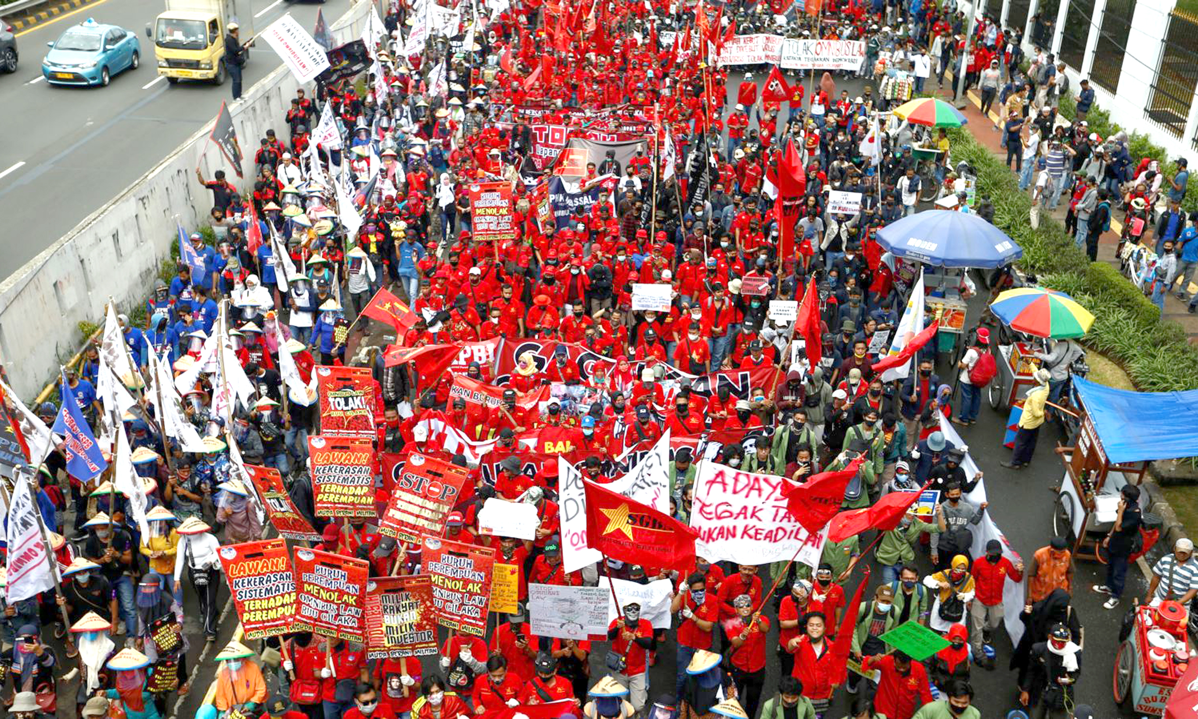 KANALKALIMANTAN.COM, JAKARTA — Sekitar lima ribu orang yang terdiri dari buruh, mahasiswa, petani dan masyarakat sipil lainnya menggelar aksi di depan Gedung DPR dari pagi hingga malam sekitar pukul 19.30 WIB. Mereka menolak omnibus law RUU Cipta Kerja yang sedang dibahas pemerintah dan DPR.