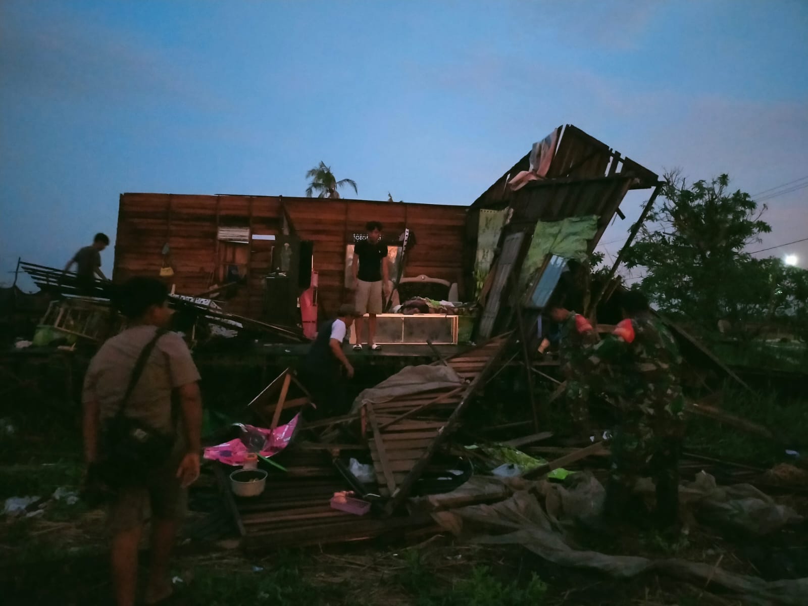 Warga beserta perangkat desa serta TNI membantu proses evakuasi penghuni, barang dan lain sebagainya hingga pukul 18.28 Wita. Dengan kondisi minim penerangan, warga memindahkan puing-puing bangunan yang tersisa akibat terpaan angin puting beliung.