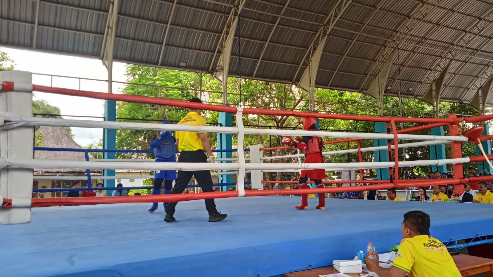 Bertanding di lapangan tenis Antaluddin yang menjadi arena Cabang Olahraga (Cabor) Muaythai, Novi sukses menyudahi perlawanan atlet muaythai asal Kabupaten Tanah Laut belum genap satu ronde.