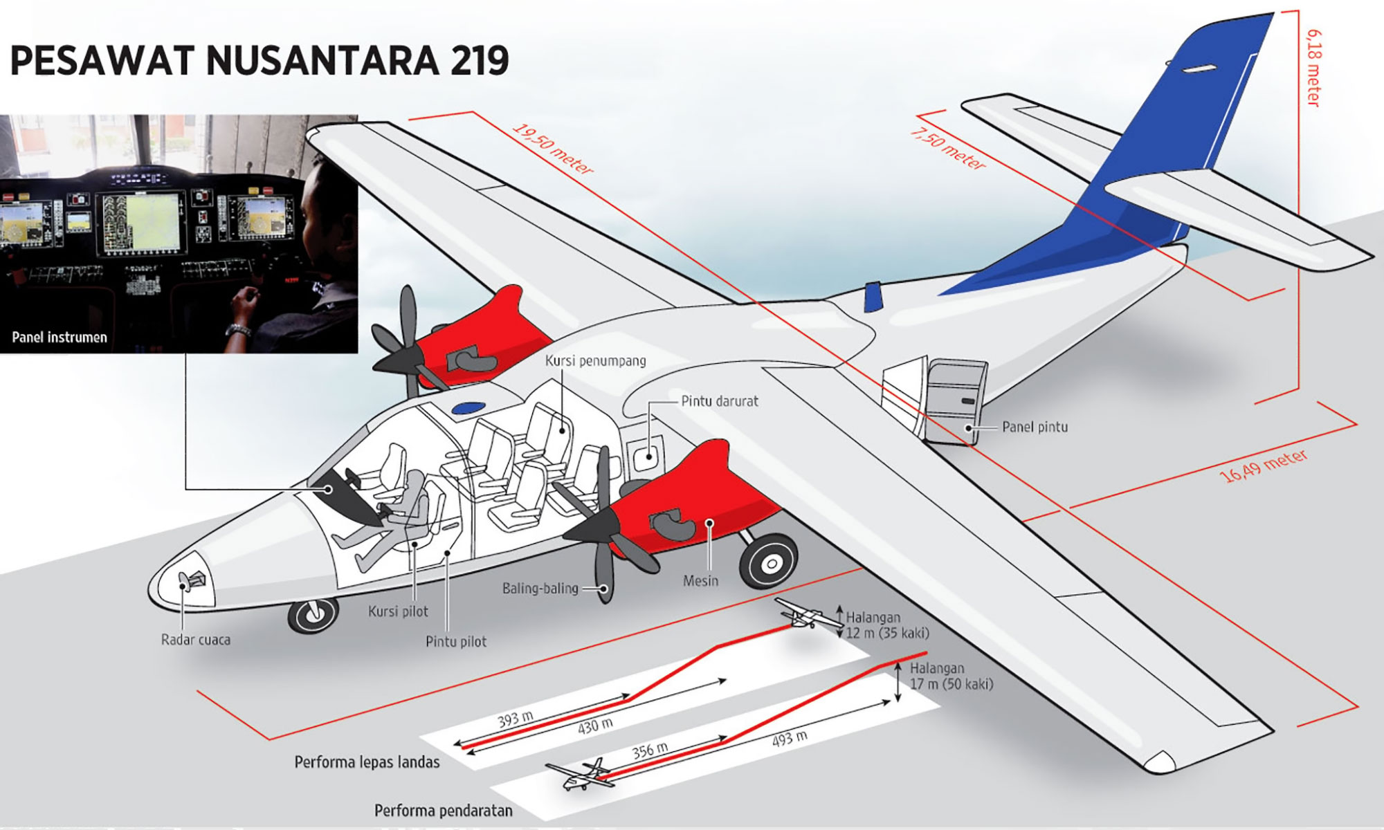 Pesawat berkelir putih ini merupakan hasil kerja sama PT Dirgantara Indonesia (Persero) (PTDI) dan Lembaga Penerbangan dan Antariksa Nasional (LAPAN). Di badan pesawat terlihat tulisan produk anak bangsa hadir untuk negeri ini mampu mengangkut 19 orang atau mengangkut beban hingga 7.030 kilogram (kg) saat take off dan 6.940 kg saat landing. Kecepatan pesawat N219 bisa mencapai 210 knot dengan kecepatan ekonomisnya 190 knot.