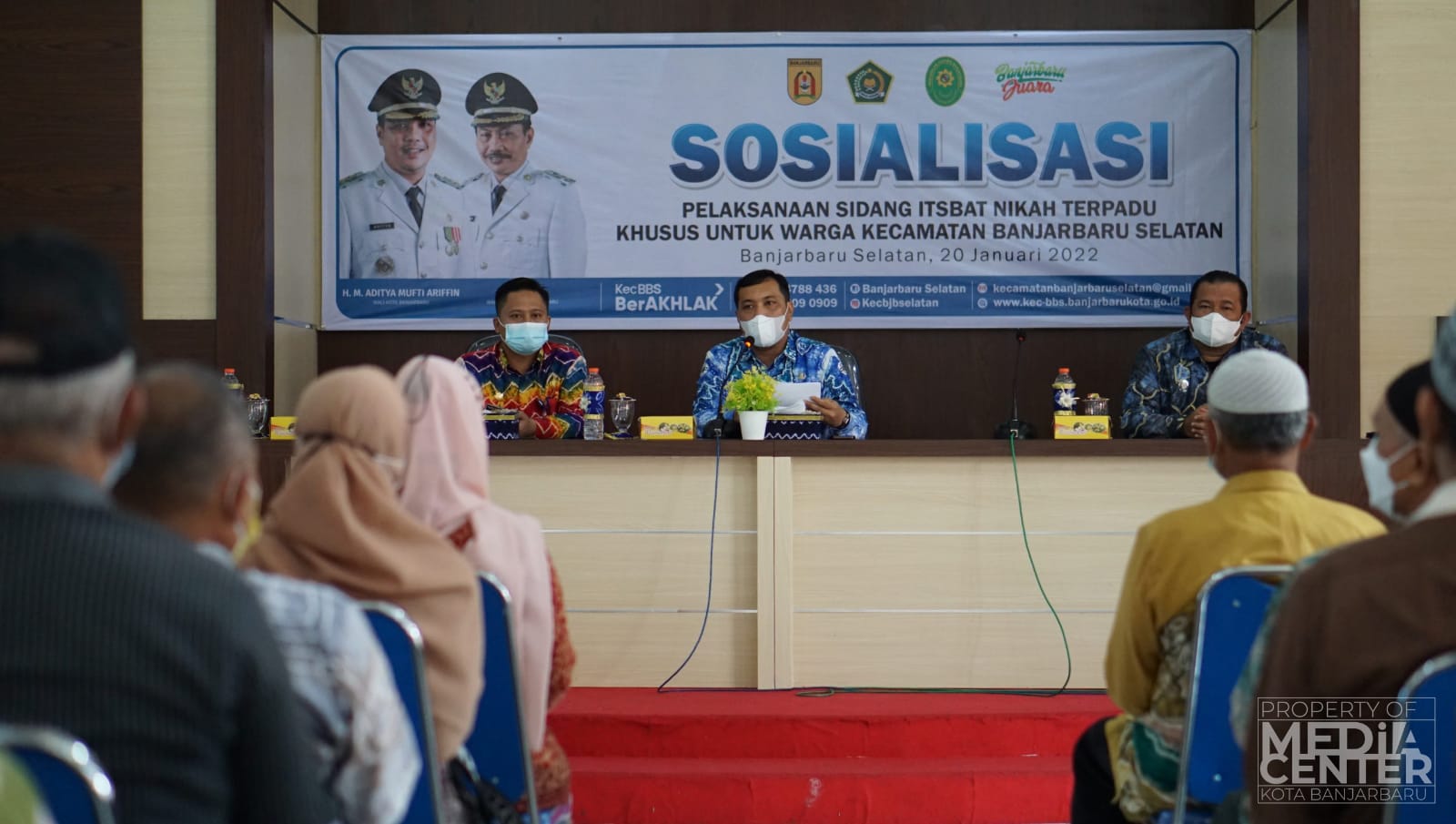 Sosialisasi pelaksanaan sidang isbat nikah terpadu di wilayah Kecamatan Banjarbaru Selatan digelar di aula kantor kecamatan, Kamis(20/1/2022) yang dihadiri Lurah se Kota Banjarbaru dan Ketua RT se Kecamatan Banjarbaru Selatan. Narasumber Wali Kota Banjarbaru Aditya Mufti Ariffin, Ketua Pengadilan Agama Kota Banjarbaru Dr H Muhammad Najmi Fajri, SHI MHI dan Camat Banjarbaru Selatan Taufik Purwanto SSTP MAP.