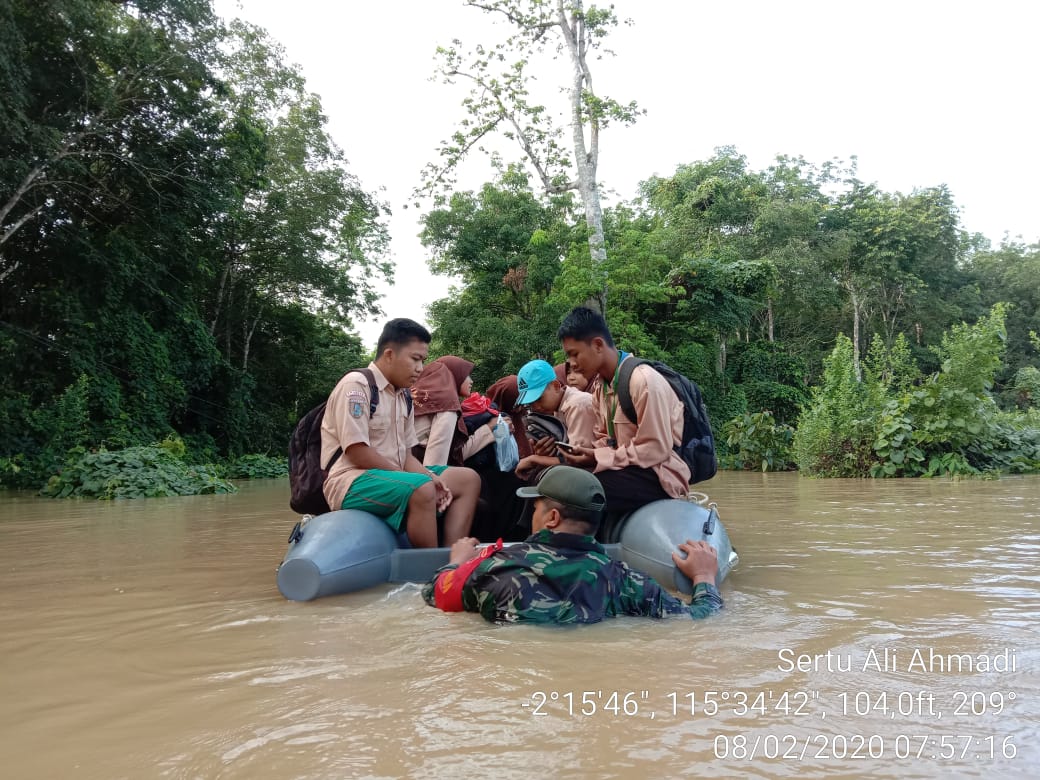 Bersama Bhabinkamtibmas Polsek Juai, dan TRC PB BPBD Balangan, TNI ikut bergerak cepat membantu penanganan banjir kepada masyarakat, termasuk kepada anak-anak sekolah.
