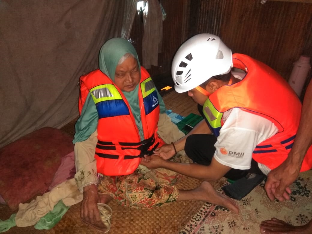 Suasana haru terlihat saat tim melakukan evakuasi terhadap Saniah. Seorang lansia penyandang tuna netra berusia 60 tahun. “Beliau kedinginan di dalam rumah, jadi kami bantu pindahkan ke pengungsian saja,†kata Riadi.