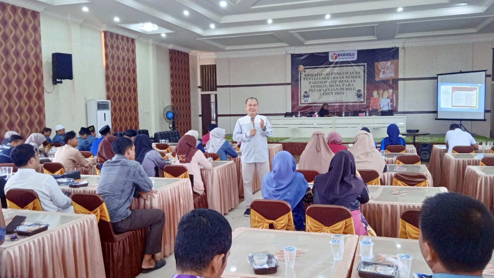 Komisioner Bawaslu HSU koordinator divisi hukum pencegahan partisipasi masyarakat, Syardani, saat membuka sosialisasi pengawasan penyelenggaraan Pemilu partisipatif dengan pemilih muda pada Pemilu 2024, di Gedung Aneka Guna Amuntai, Jumat (26/1/2024) mengatakan, pentingnya bagi pemilih pemula untuk mengetahui dan memahami apa saja tentang Pemilu hingga pelanggaran-pelanggaran yang ada saat pemilu.
