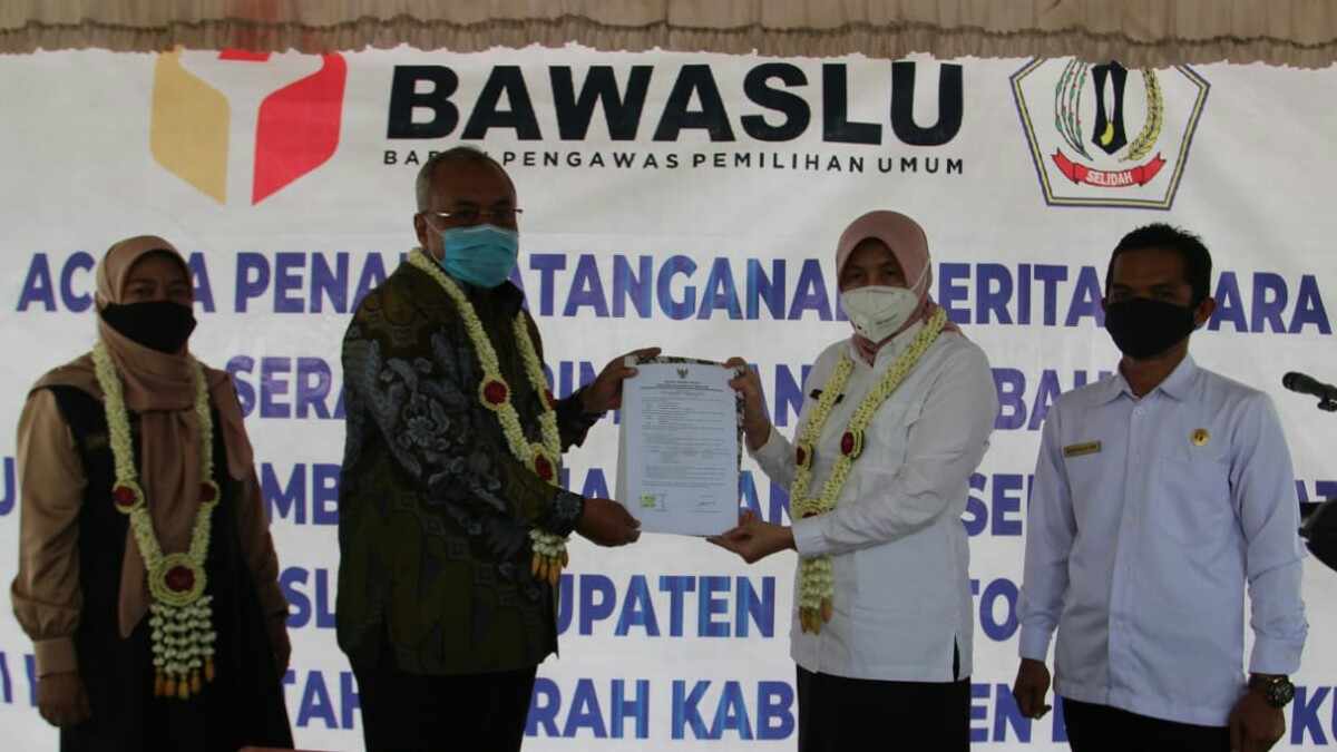 Penyerahan hibah tanah ditandai penandatanganan naskah perjanjian hibah daerah. Serta berita acara serah terima oleh Bupati Barito Kuala Hj Noormiliyani AS dengan Sekjen Bawaslu RI Gunawan Suswantoro. Acara penyerahan tanah hibah ini juga berisi pembukaan papan selubung nama.