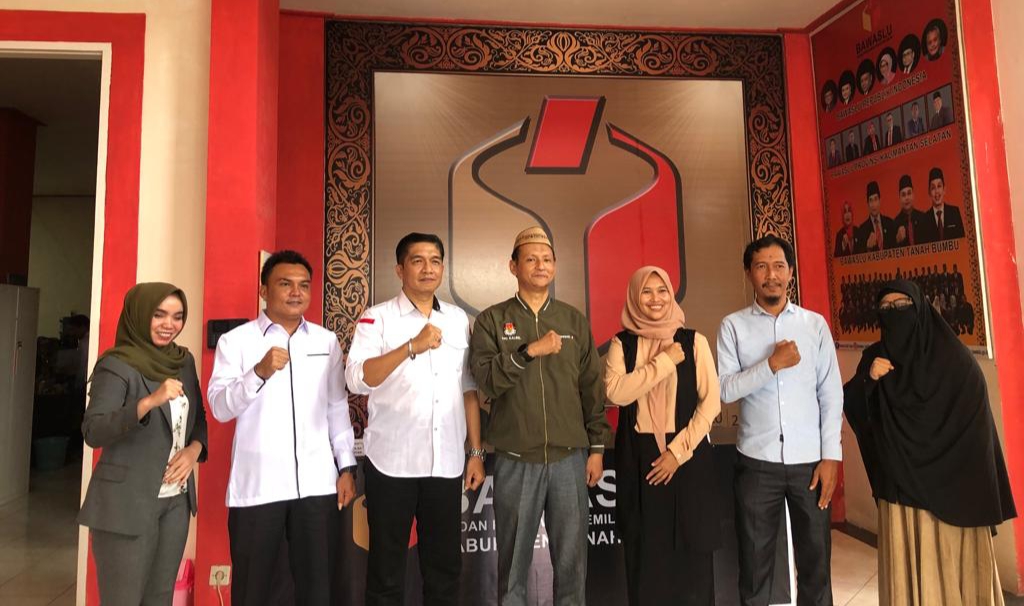 Kunjungan rombongan KPU Kalsel dipimpin Komisioner KPU Kalsel Koordinator Divisi Data dan Informasi, Siswandi Reya’an disambut oleh Ketua Bawaslu Tanbu H Kamiluddin Malewa beserta jajaran.