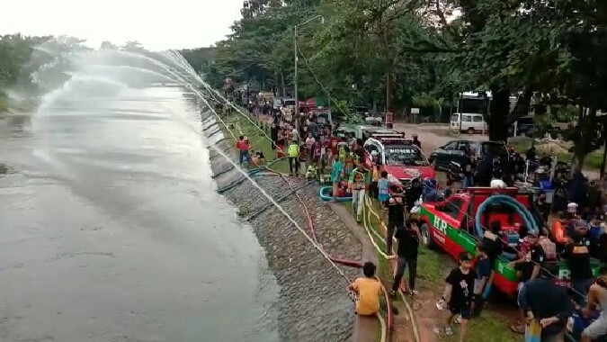Masing-masing menumpangi unit atau mobil pemadam dan berjejer di tepi saluran irigasi. Bukan karena ada kebakaran, mereka menggelar latihan bersama.