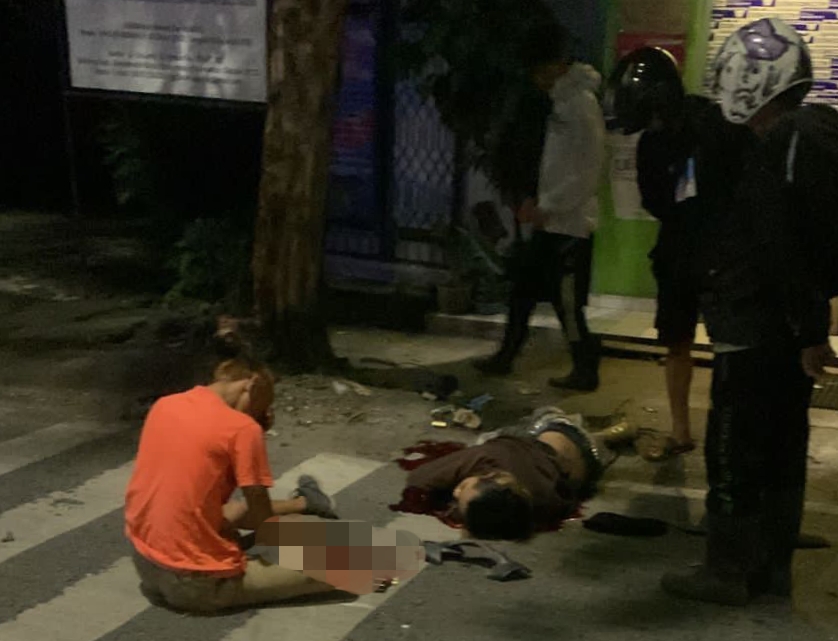 Dua orang laki-laki itu nampak tergeletak bersimbah darah di pinggir jalan yang berdekatan dengan sebuah pohon.
