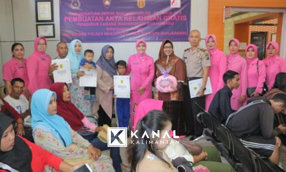 BANJARBARU, Memperingati Hari Kesatuan Gerak Bhayangkari (HKGB) ke-66, pengurus Bhayangkari Cabang Banjarbaru bekerjasama dengan Dinas Kependudukan dan Pencatatan Sipil (Disdukcapil) Kota Banjarbaru, membagikan 100 akta kelahiran kepada orang tua anak, pada Jumat (10/8) di kantor Disdukcapil Banjarbaru.