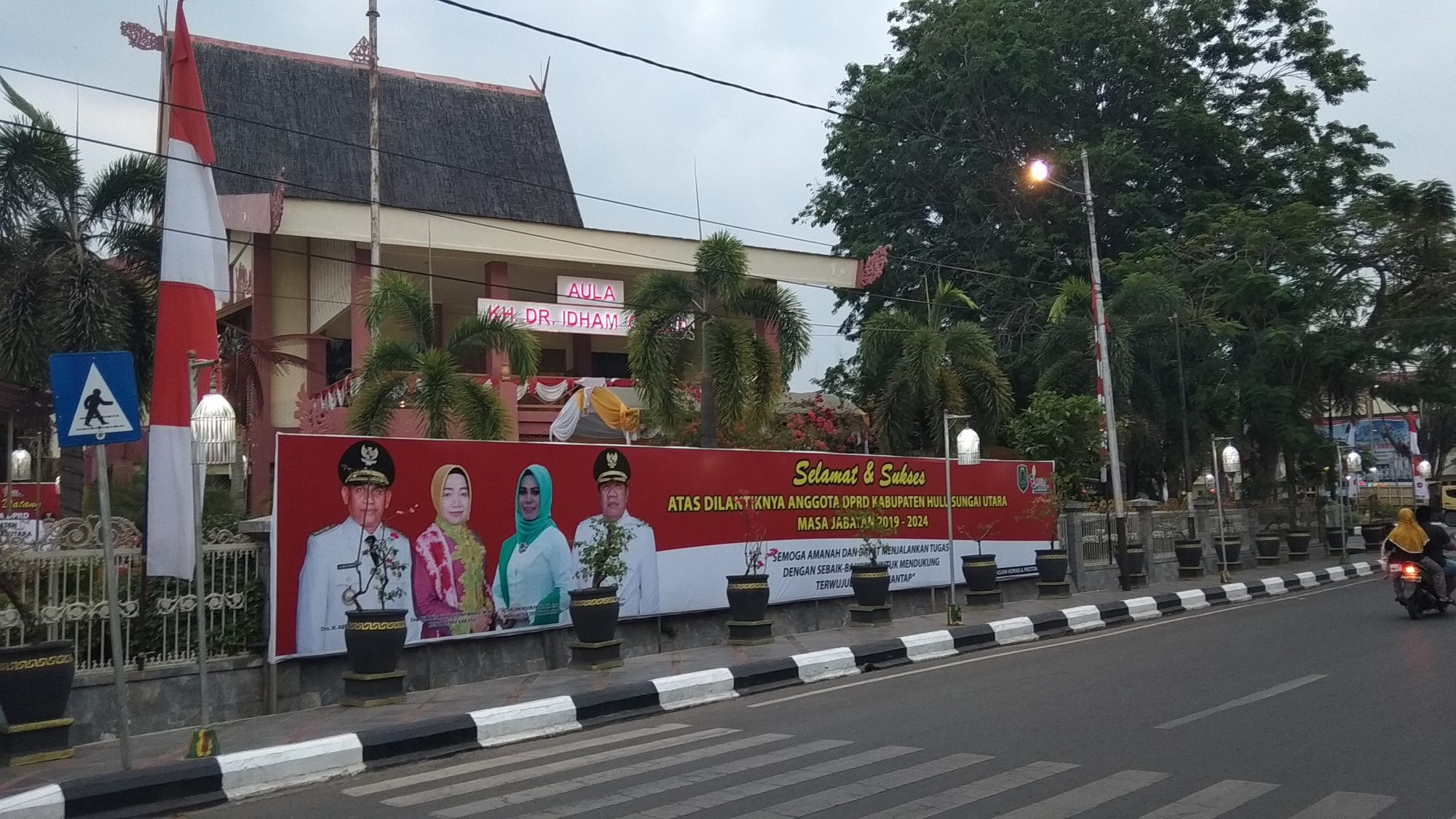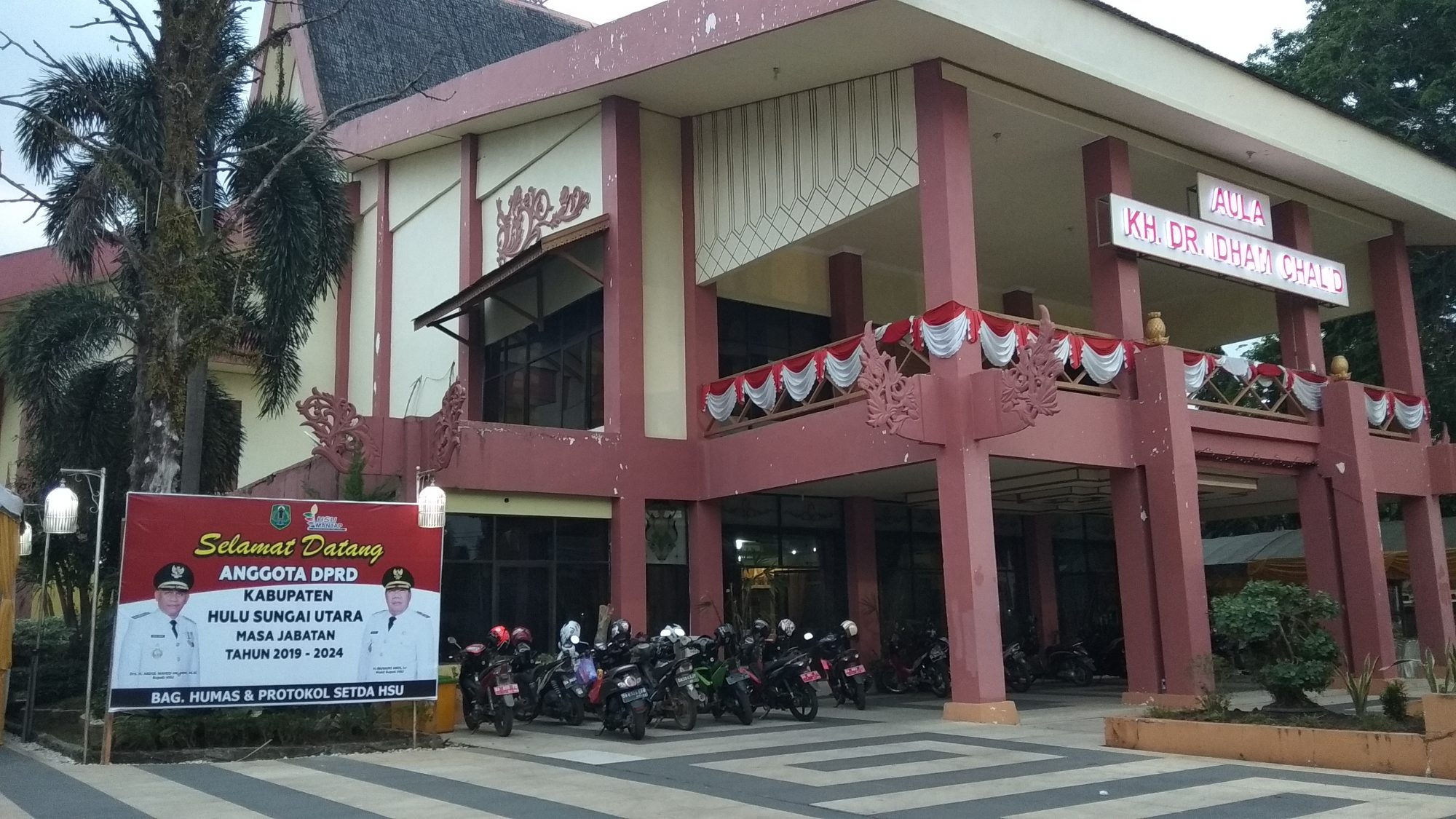 AMUNTAI, Jelang pelantikan 30 anggota Dewan Perwakilan Rakyat Daerah (DPRD) Kabupaten Hulu Sungai Utara (HSU) periode 2019-2024, Senin (5/8), sejumlah persiapan telah dilakukan. Mulai dari undangan, kursi, meja, properti, tenda, bahkan benner ucapan selamat dari Pemerintah Daerah HSU sudah mulai tampak terpampang di depan Aula Dr KH Idham Chalid. Tepat berdampingan dengan Rumah Dinas Bupati Hulu Sungai Utara.