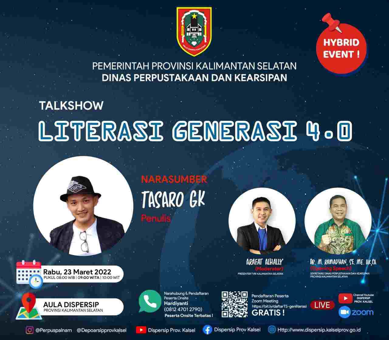 Bertajuk “Talkshow Literasi Generasi 4.0”, narasumber yang mempunyai banyak prestasi dan karya tersebut bakal hadir dan mengisi kegiatan pada hari Rabu (23/3/2022), pukul 09.00 WITA.