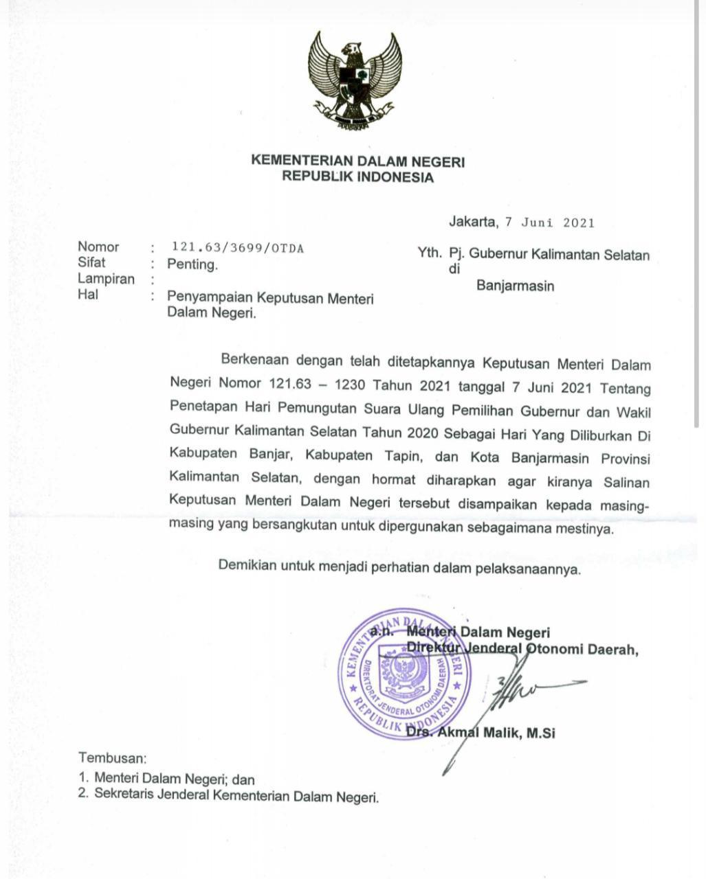 KANALKALIMANTAN.COM, BANJARMASIN – Setelah mendapat izin Kementerian Dalam Negeri (Kemendagri), Pemprov Kalsel menetapkan pelaksanaan Pemungutan Suara Ulang (PSU) Pilgub Kalsel pada Rabu (9/6/2021) sebagai hari libur di daerah berlangsungnya PSU.