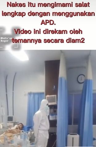 Nakes itu masih menggunakan APD lengkat saat menjadi imam salat bagi pasien Covid-19. Momen nakes menjadi imam salat pasien Covid-19 direkam diam-diam oleh temannya. Di video tertulis momen mengharukan itu terjadi di sebuah rumah sakit Swasta di Kabupaten Bogor.