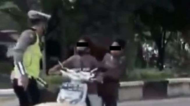 Mereka nekat mengendarai sepeda motor di jalanan tanpa memakai helm. Melihat hal itu, seorang polisi lalu lintas berusaha menghentikan.