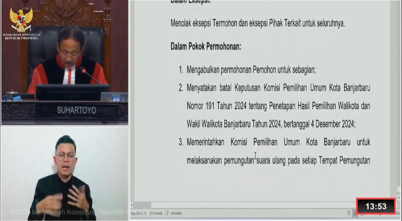 Diketahui, perkara nomor 05/PHPU.WAKO-XXIII/2025 tersebut pemohonnya adalah Muhammad Arifin, pemantau Pemilu dari Lembaga Visi Nusantara Kalimantan (LS Vinus) Kalimantan Selatan.