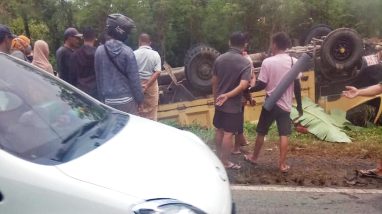 Dari sebuah video yang beredar berdurasi 10 detik, memperlihatkan satu buah truk berwarna kuning terbalik, menimpa satu unit sepeda motor. Informasi dari grup emergency ada satu orang korban yang terjepit.