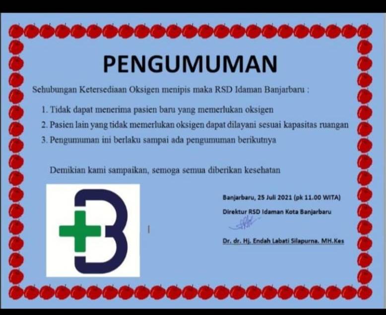 Maka RSD Idaman Banjarbaru tidak dapat menerima pasien baru yang memerlukan oksigen, serta pasien lain yang tidak memerlukan oksigen dapat dilayani sesuai kapasitas ruangan.