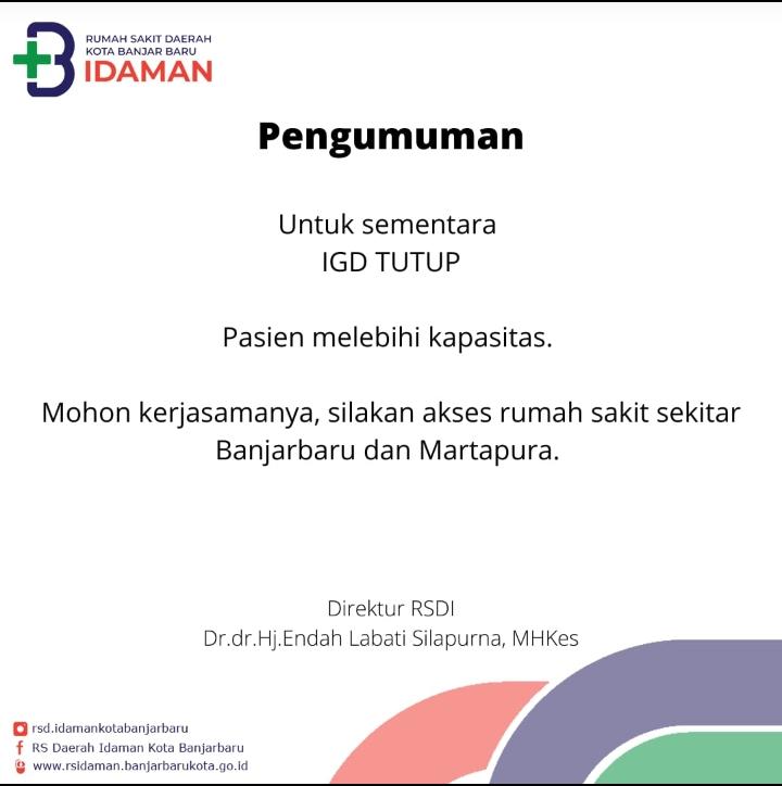 BREAKING NEWS. Pasien Lebihi Kapasitas, RSD Idaman Banjarbaru Tutup IGD