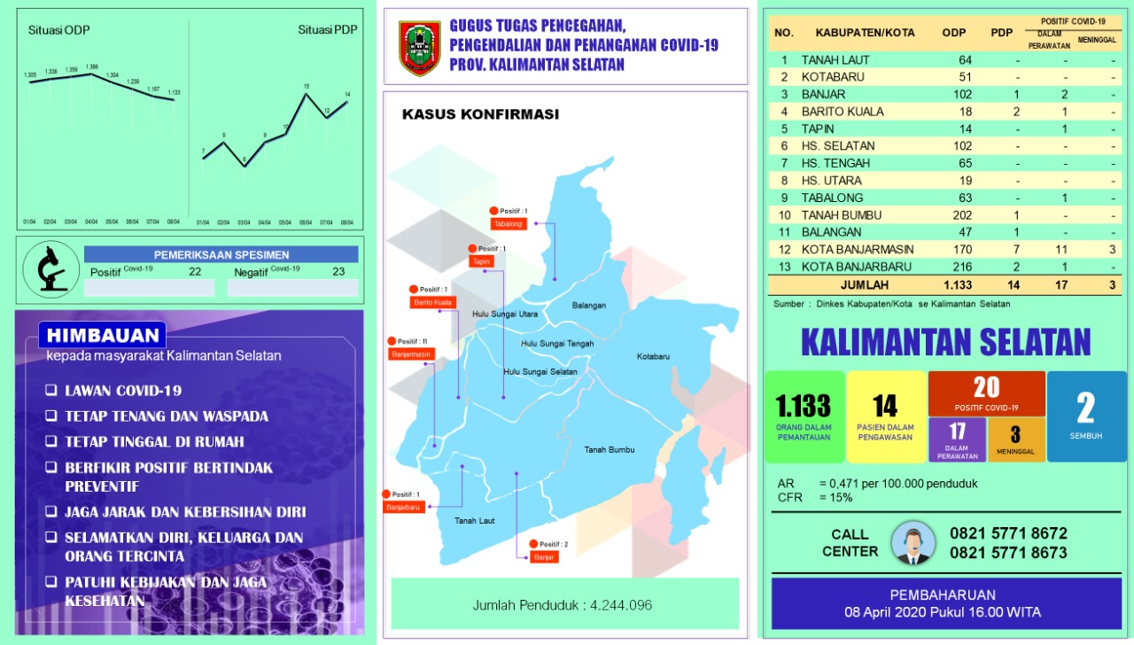 Data Covid-19 Kalsel Rabu 8 April 2020 pukul 16.00 Wita. Foto : Gugus Tugas P3 Covid-19 Kalsel
