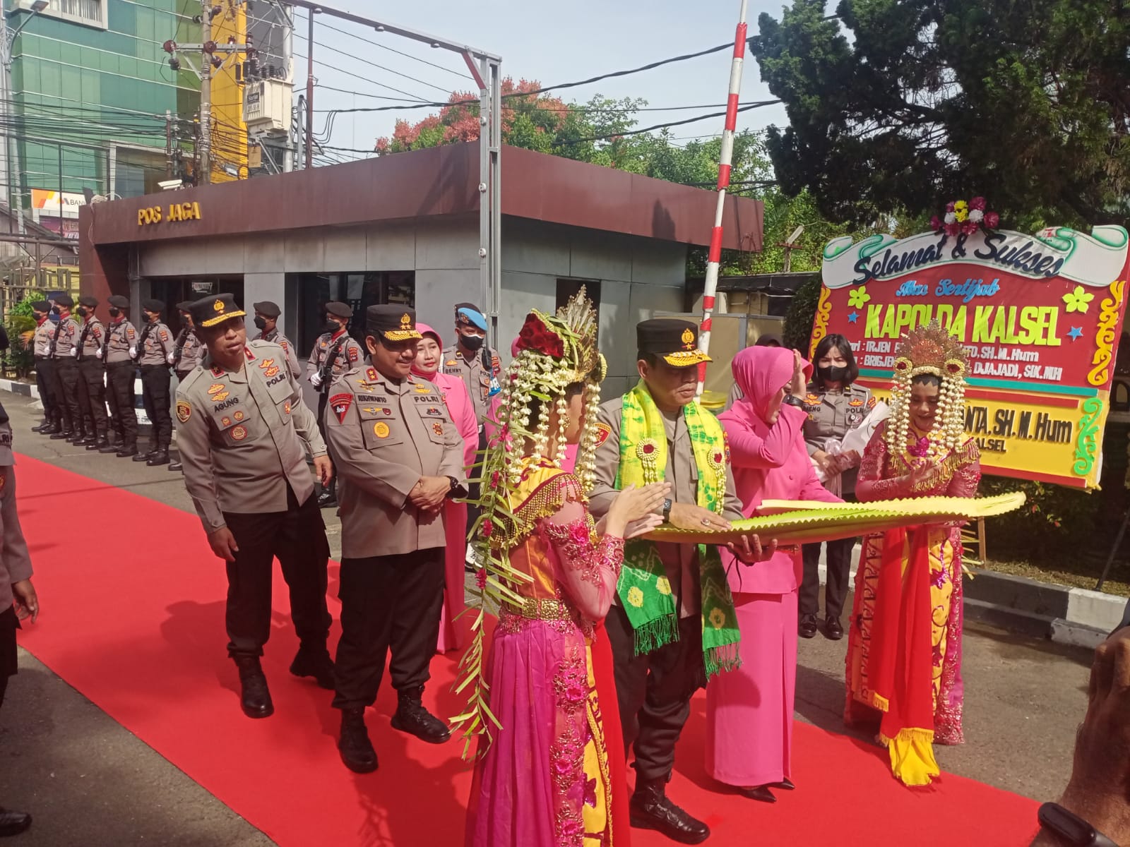 Kapolda Kalsel yang baru mantan Dirtipidum Bareskrim Polri tersebut disambut dengan tarian Baksa Kembang khas Kalsel dan prosesi pemukulan pelepah mayang. Selain itu, iringan seni tari islami Sinoman Hadrah juga turut ditampilkan sebagai ucapan selamat datang.